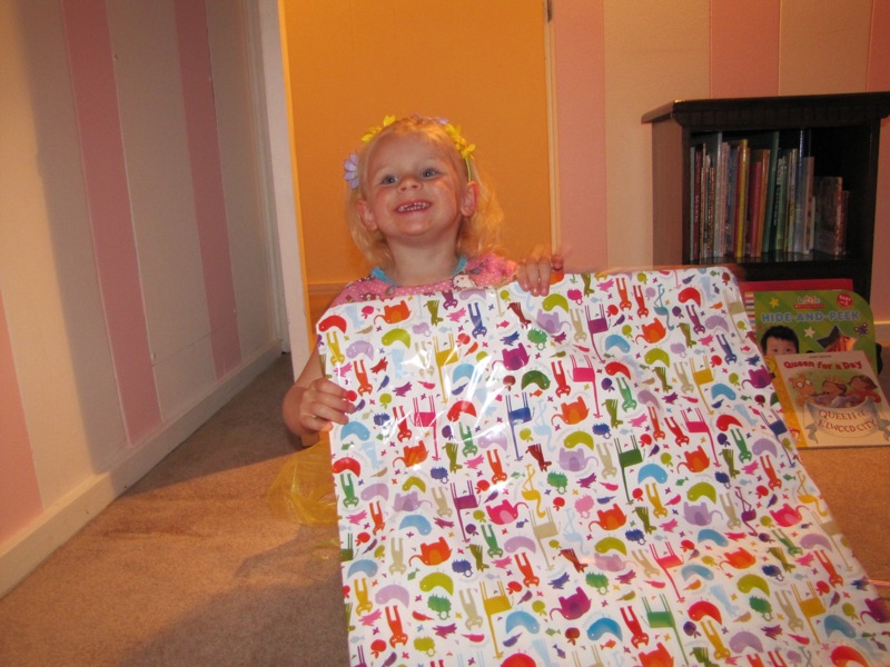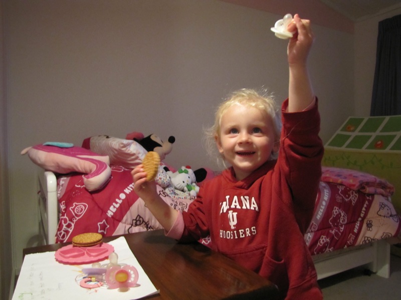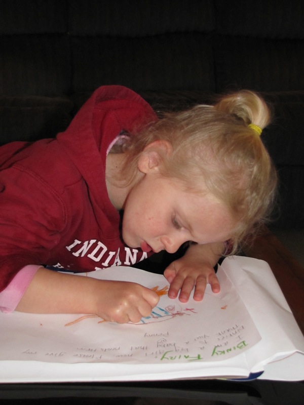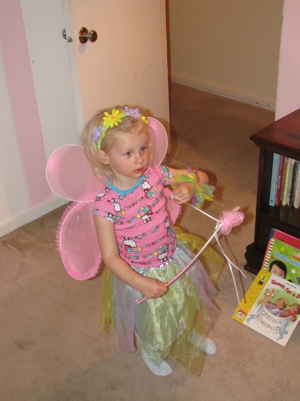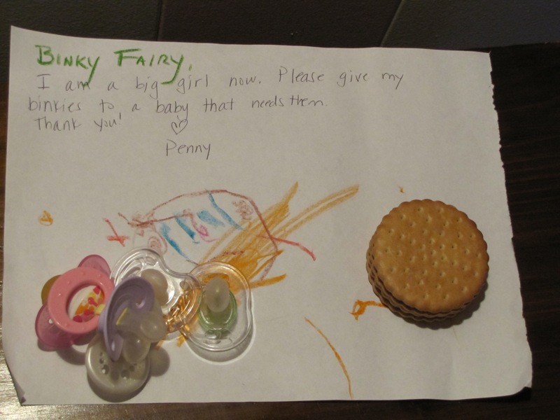Last Friday, after much discussion, Penny eagerly awaited a visit by the binky fairy. Penny was a little apprehensive about giving up her binky (which she only used for sleep), but she decided she was a big girl and it was time. She helped make a note for the binky fairy and then placed it on her bedside table with her binkies and some cookies (her idea). She was thrilled when she found a present where she had placed her binkies. A fairy outfit!!