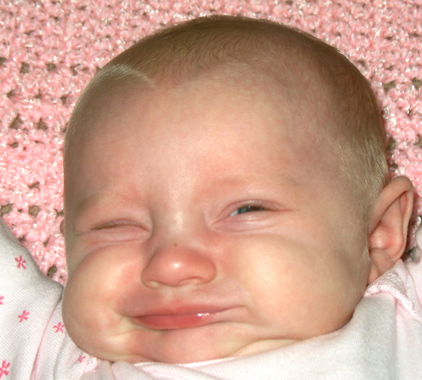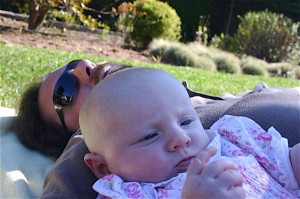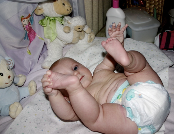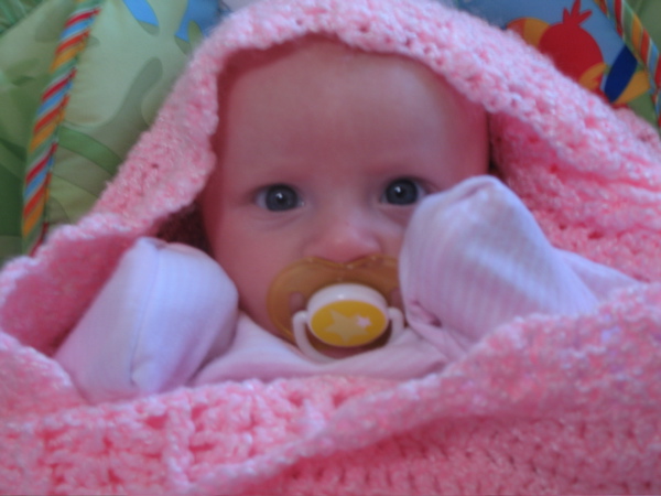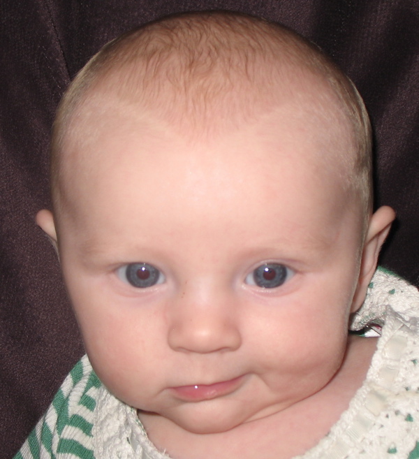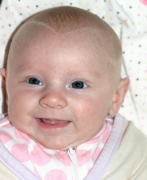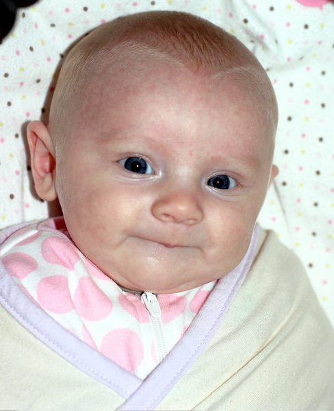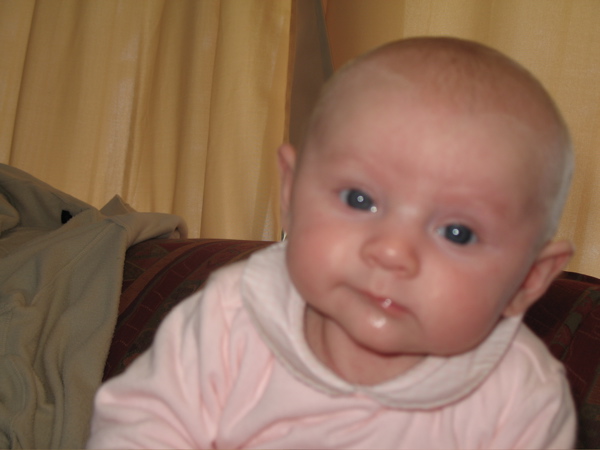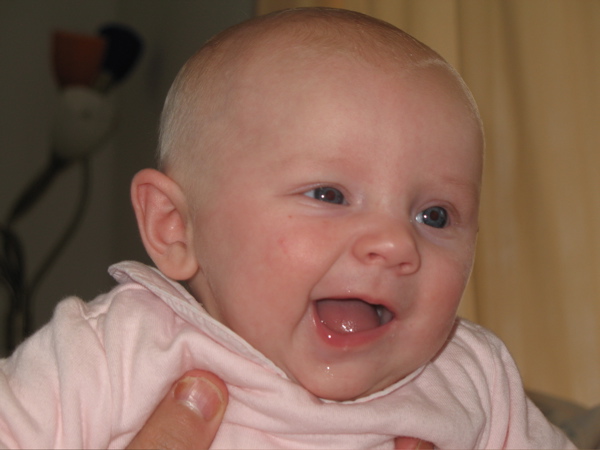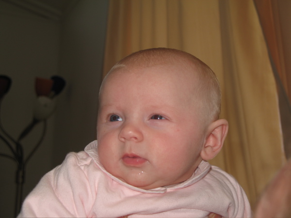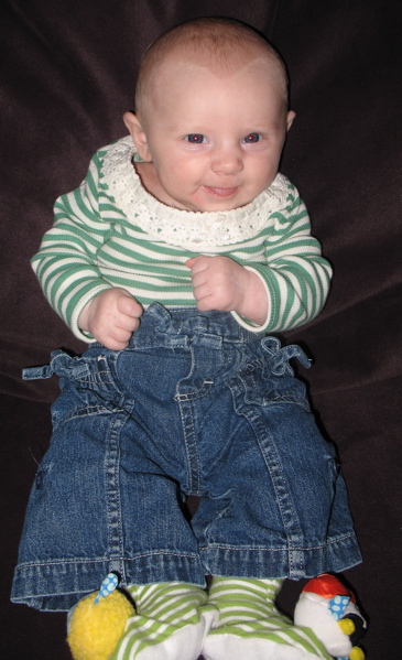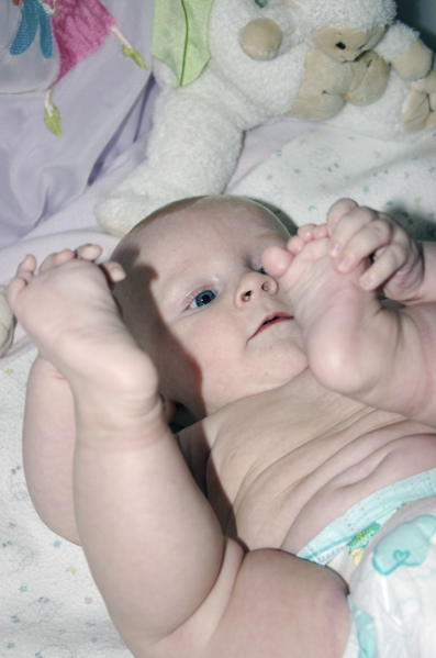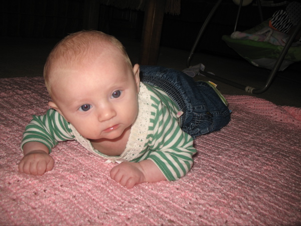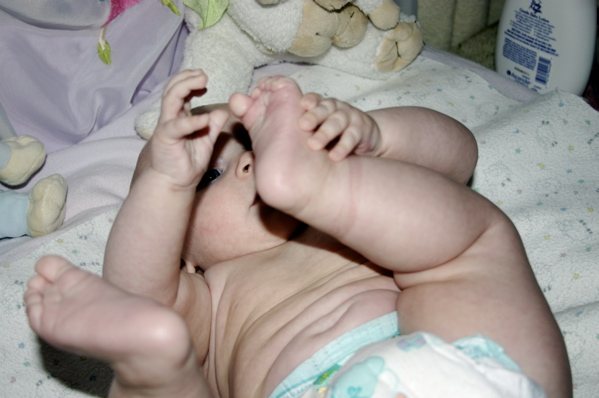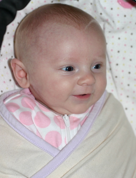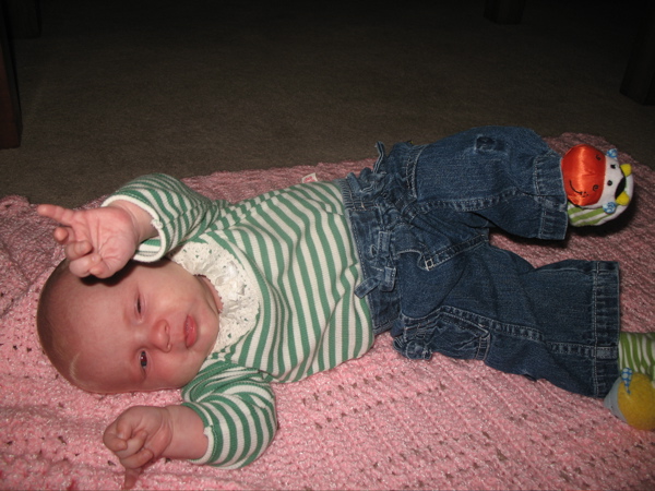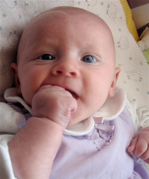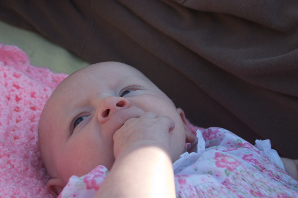 After eating breakfast, I got her dressed so we could go out with some friends and found that she has found her hands and enjoys sucking on them. Â She hasn’t figured out each individual finger so she tries to shove the whole fist in.
