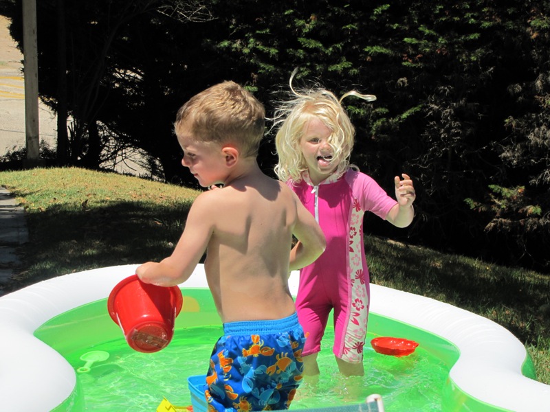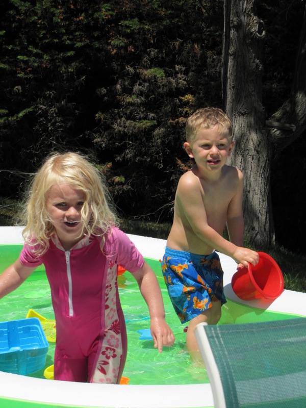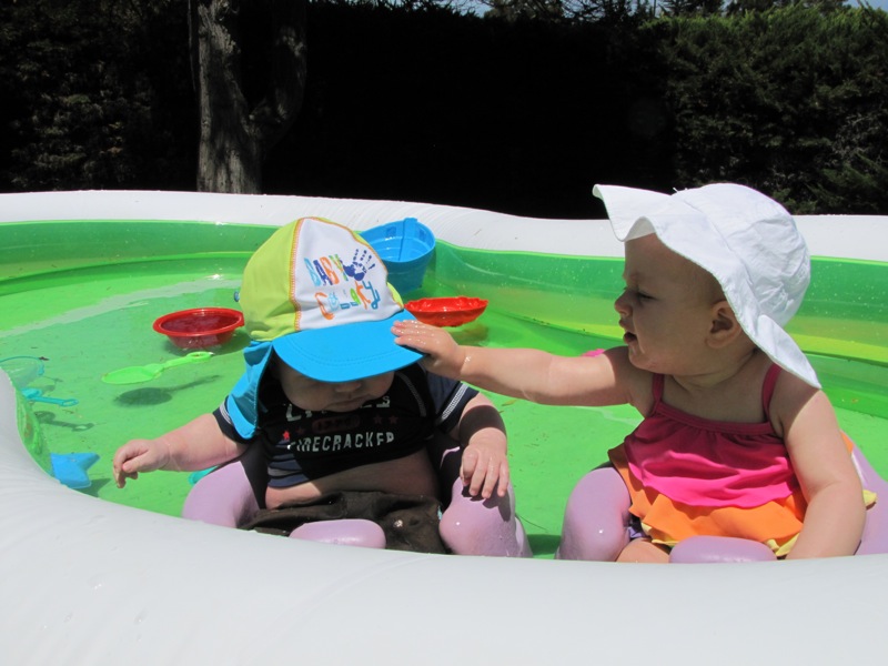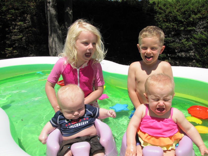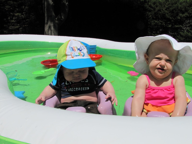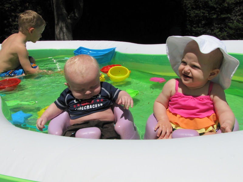 Penny called her friend Ben yesterday to invite him over to swim. “Ben, I love you soo much!! Wanna come over? You like to swim with me??” Followed by a a language all their own. Too cute! Charlotte also was able to come, so she and Teddy relaxed in their Bumbo chairs in the pool. Fun times!!
